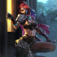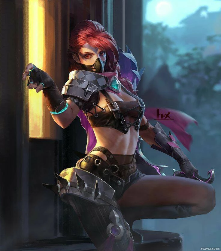 red hair and is wearing a mask, which conceals her eyes. She is dressed in armor with