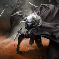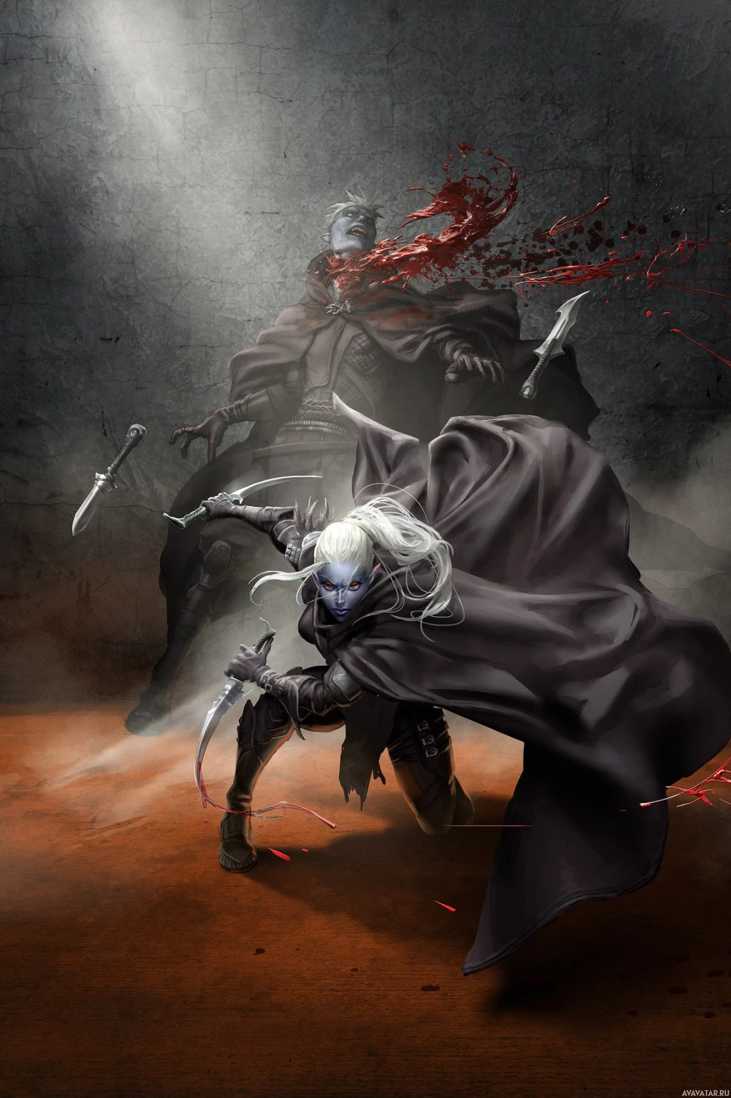 long hair; this is commonly associated with the drow race in D&D lore. The middle character is also cloaked and has