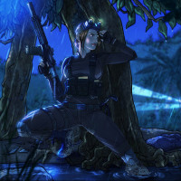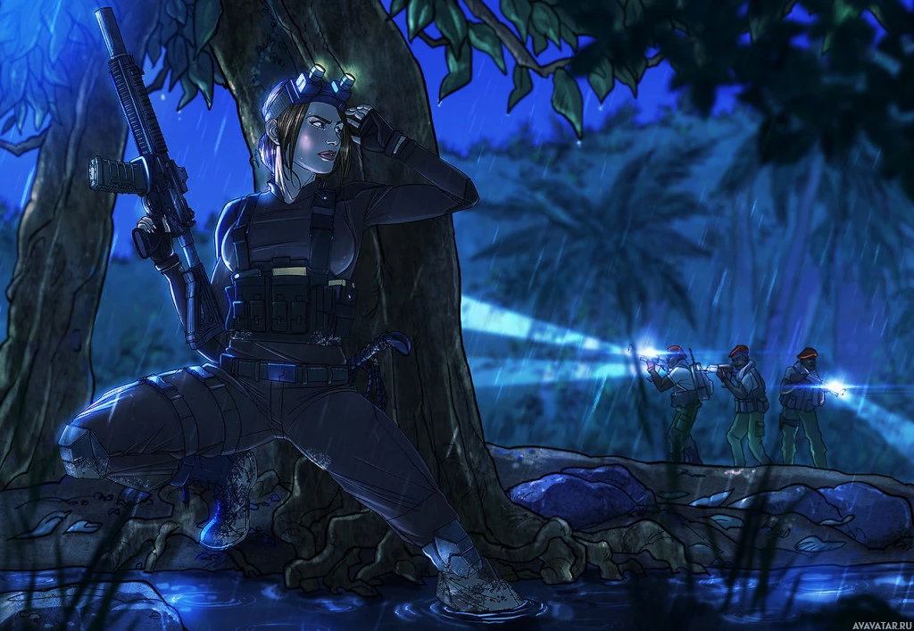 combat readiness. The setting looks like a jungle or forest at night, with the rain creating a moist atmosphere.