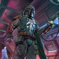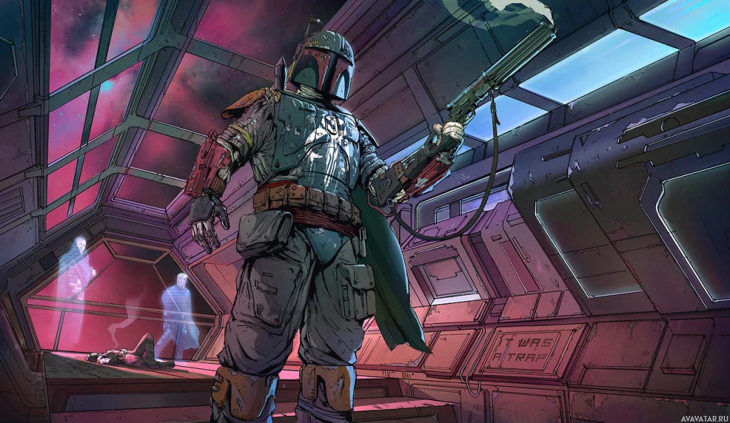 full armor, holding a rifle, and standing within what appears to be the cockpit or control room of a spacecraft. The setting suggests a scene that might be taking place during an adventure or mission, consistent with the narrative elements found in Star Wars media.