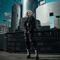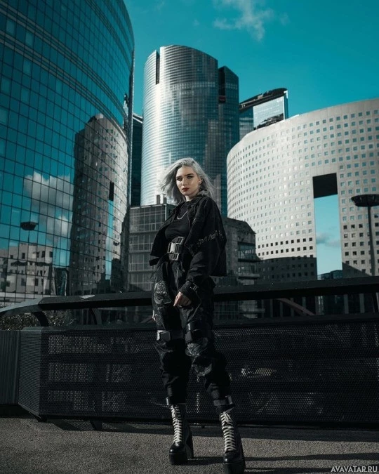city skyline. She has a bold, edgy appearance with her hair dyed in