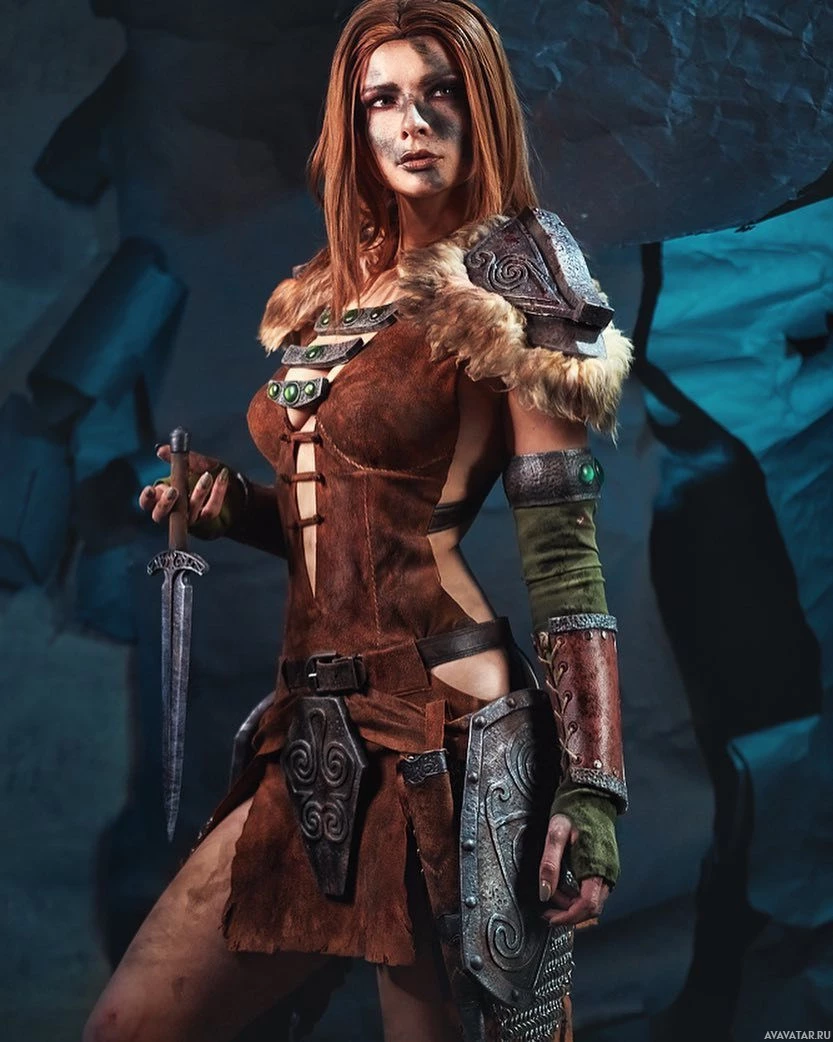 red hair and makeup that enhances their character's look, complete with intricate facial designs. In the character's hand, they are holding a sword with both hands, ready for action as Aela is known for her