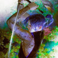 blue hair tied in a high ponytail. They are also adorned with tattoos on their arms and shoulders. The background features elements of nature such as birds and greenery, suggesting a forest or