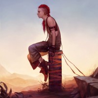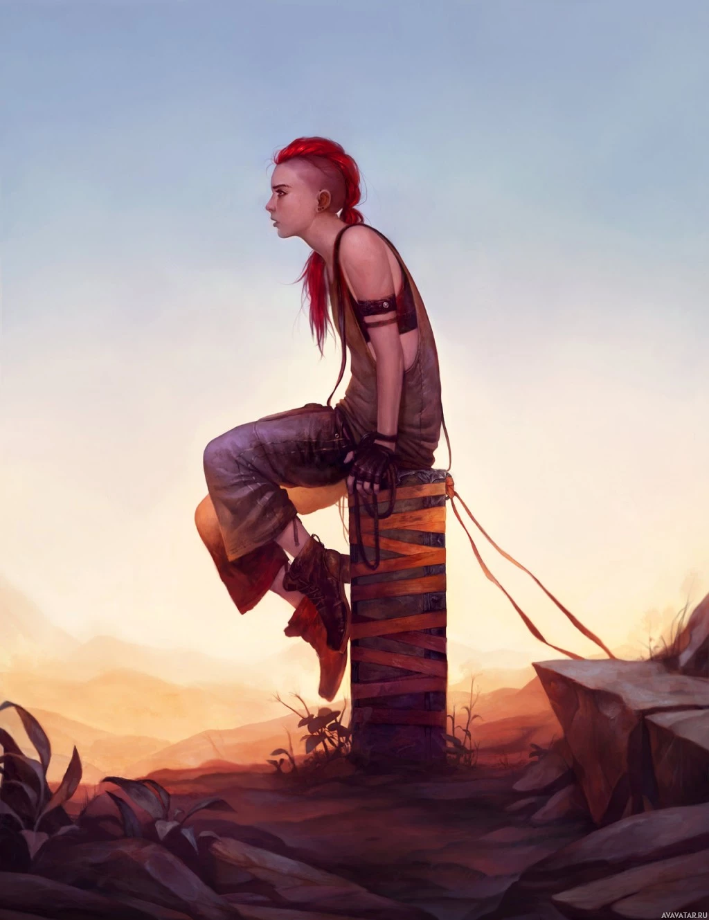 a leather armor or harness and has multiple piercings on their face and arms, suggesting a rebellious or adventurous nature. They are holding onto something that resembles a boulder or statue with one hand while sitting. The overall scene conveys