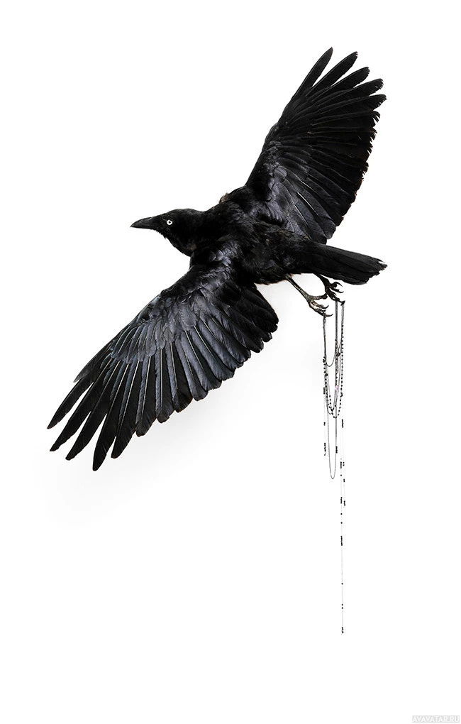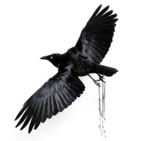 a black bird, specifically a crow, in mid-flight with its wings spread wide. There are visible