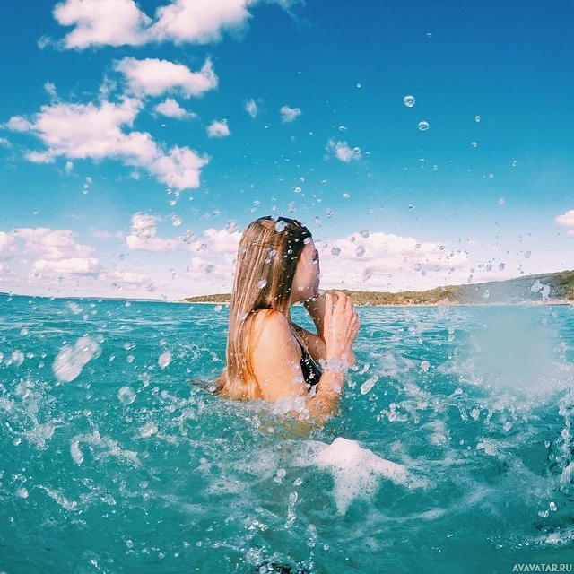 На снимке изображена женщина в воде на пляже. Она, кажется, наслаждается собой, поскольку окружена небольшими волнами, плещущимися вокруг нее. Ее волосы мокрые, что говорит о том, что она играла или плавала в море. На заднем плане ясное небо и, кажется, береговая линия с зеленью.