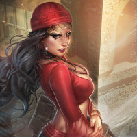 This is an illustration of a woman. She has dark hair and is wearing a red outfit with some gold accents, reminiscent of a superhero costume. The character is depicted from behind, showcasing her posture and the design of her outfit.