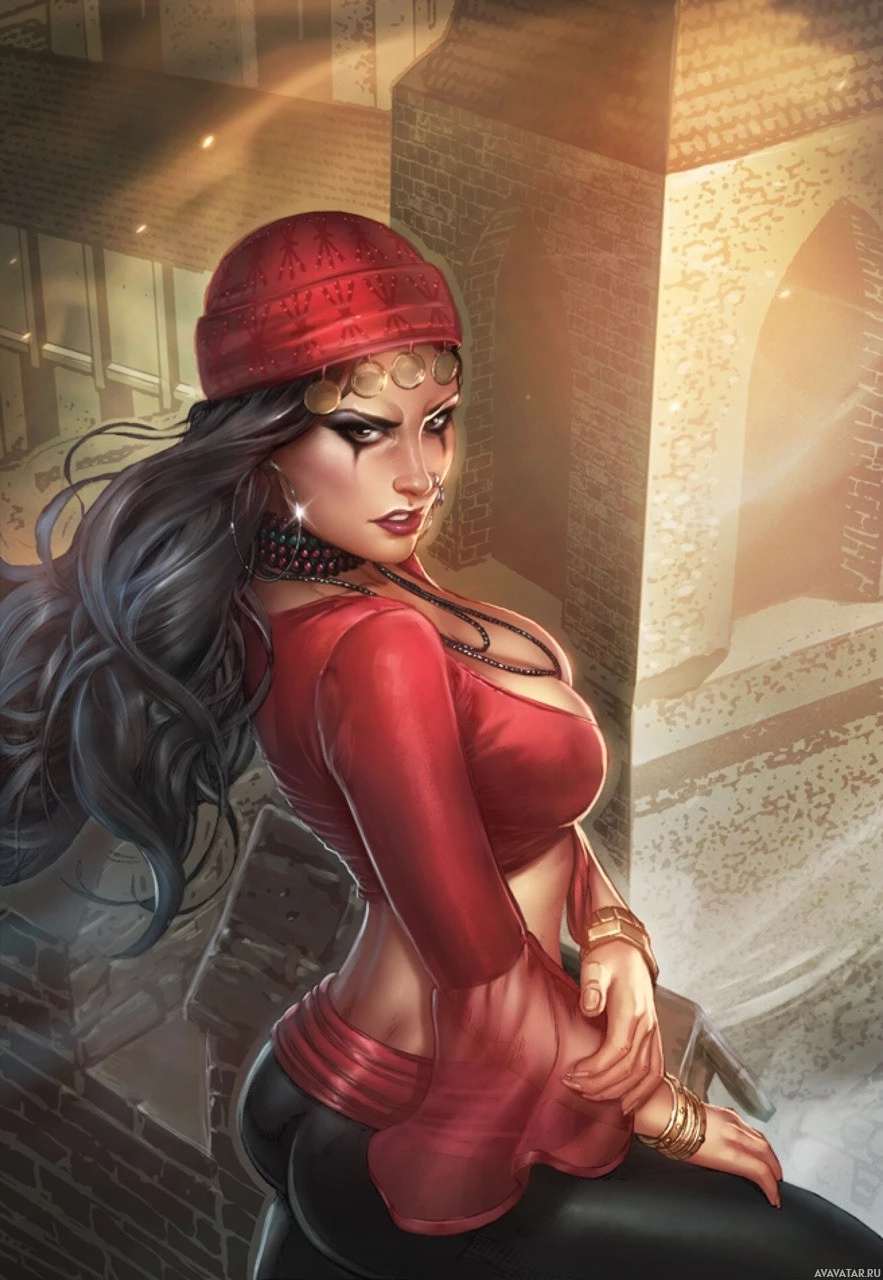 Это иллюстрация женщины. У нее темные волосы и на ней красный наряд с золотыми акцентами, напоминающий костюм супергероя. Персонаж изображен сзади, демонстрируя ее осанку и дизайн ее наряда.