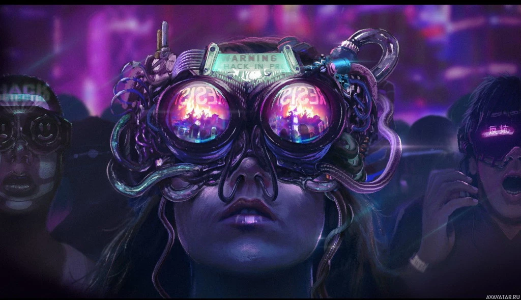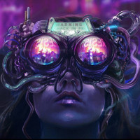 an immersive experience, as suggested by the glowing effect around their eyes and the intricate technology that surrounds them. The setting looks like a nighttime cityscape with