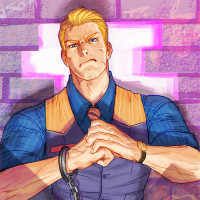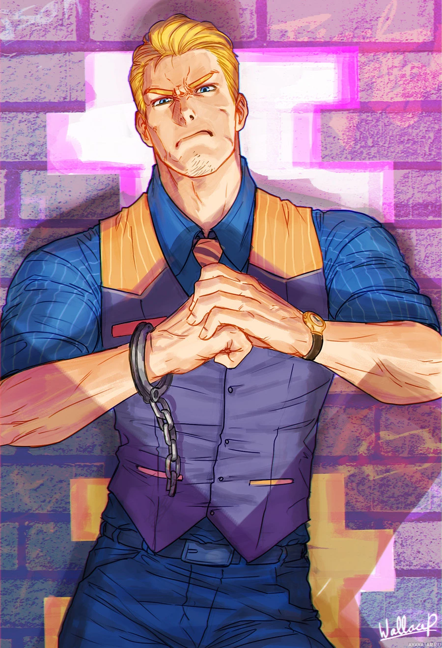 a brick wall, and there are pixel-style designs or patterns on the wall, giving it a digital or video game feel. The character is drawn in an exaggerated style with bold lines and vibrant colors, which is typical of certain