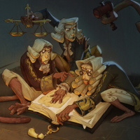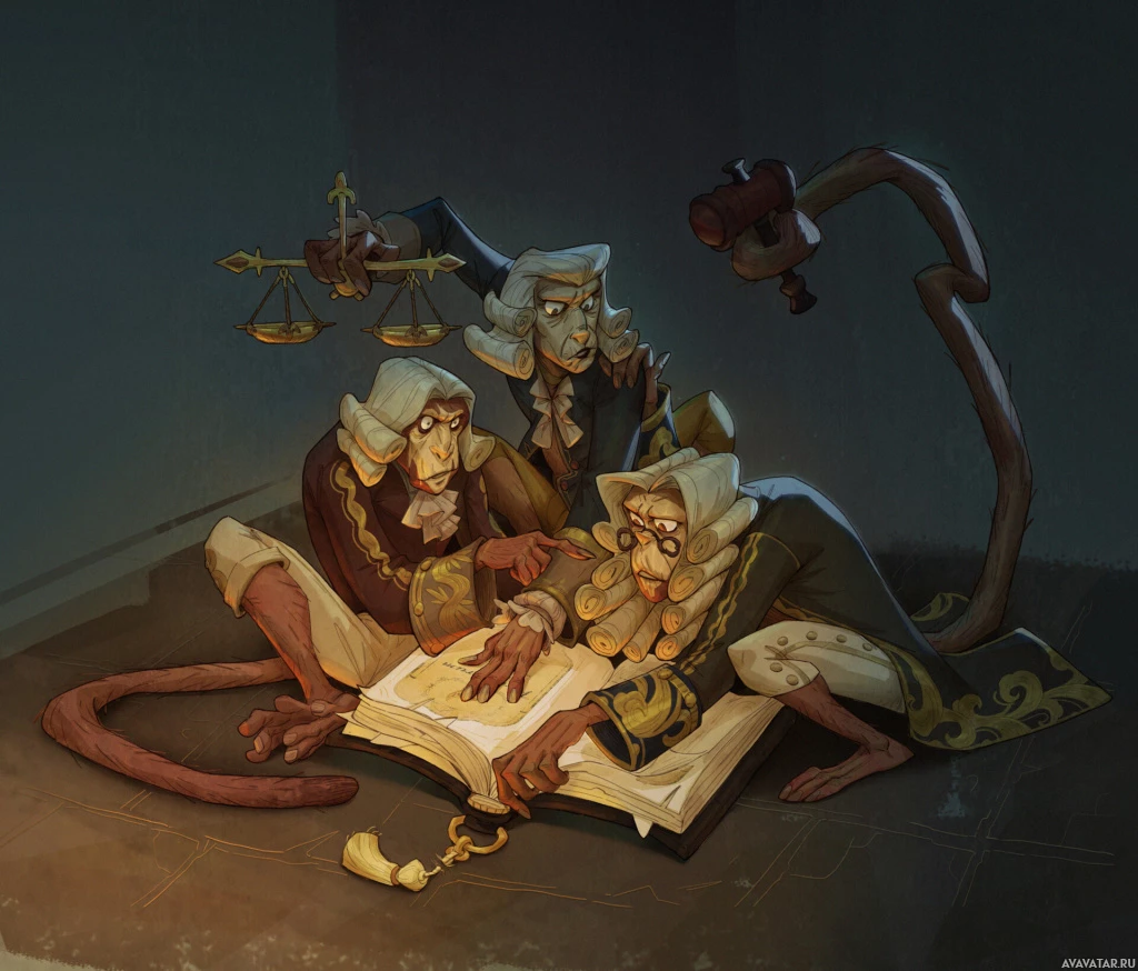 a scholarly activity. They are surrounded by various items that suggest they might be studying law or some form of jurisprudence. One monkey is holding a book open, while another appears to be reading it, and the third has a scroll or manuscript spread out before them. There's also a small sculpture of