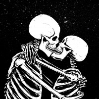 The image depicts two skeletons embracing each other. They appear to be in a romantic or affectionate pose, with one of the skeletons leaning over the other and their faces close together, suggesting that they are kissing. The background is dark with stars visible, which could imply a night