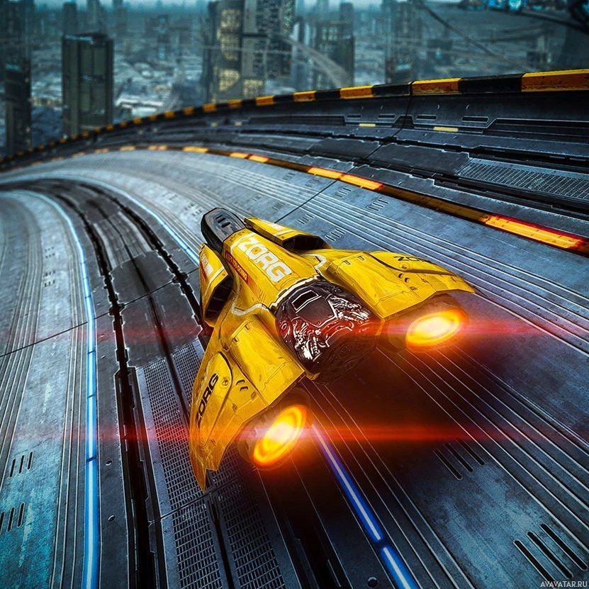 advanced technology. There is a high-speed, racing-style car that appears to be in motion on what looks like a high-tech track or ramp. The setting suggests