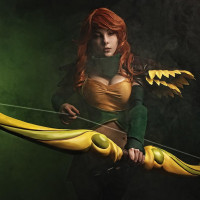 the video game "Dota 2." They are holding a bow and arrow, which is consistent with Windranger's appearance in the game. The background has a greenish hue, and there appears to be some mist or