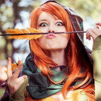 long hair and is holding an arrow on a bow, which is part of the character's iconic appearance. The background suggests she might be at an event or convention related to cosplay or