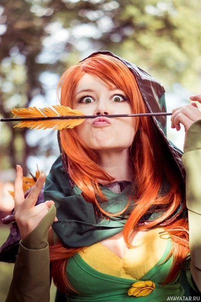 a character from Dota 2. She is dressed in a costume that includes green and yellow elements, representing the colors of the Windranger's outfit in the game. She has