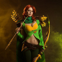 The image shows a person dressed in a costume that resembles Windranger from the game Dota 2. This character is known for her green and yellow outfit, which includes a top with a bow motif on the front. She is holding a bow that matches the colors of her outfit and wearing a quiver on her back. The background has