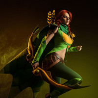 the essence of the character. It features green and yellow elements that are characteristic of the Windranger's appearance in the game. The pose suggests action or readiness for battle, which aligns with