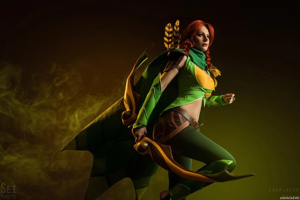 a cosplay outfit that represents the Windranger character from the game "Dota 2." This costume is vibrant and detailed, capturing