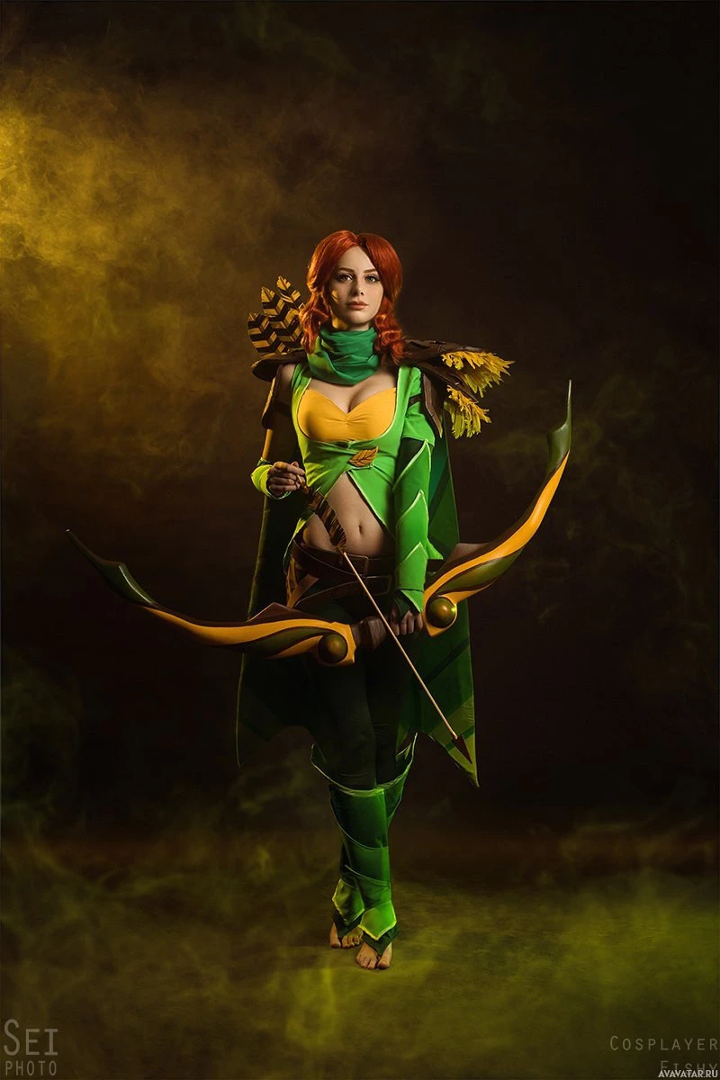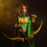 На данной картинке изображен косплеер, одетый как Виндрангер, персонаж из игры Dota 2. Человек носит костюм, включающий зелёную и золотую броню с колчаном стрел на спине, которые являются характерными элементами внешности этого персонажа в игре. Они держат лук и имеют сфокусированное выражение лица.