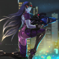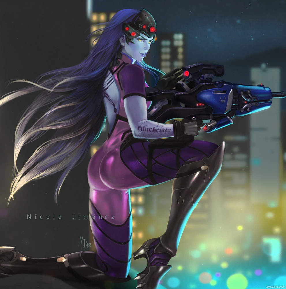 an animated character in a pose that suggests she is playing the game Overwatch. The character is known as Widowmaker, who is associated with the Overwatch