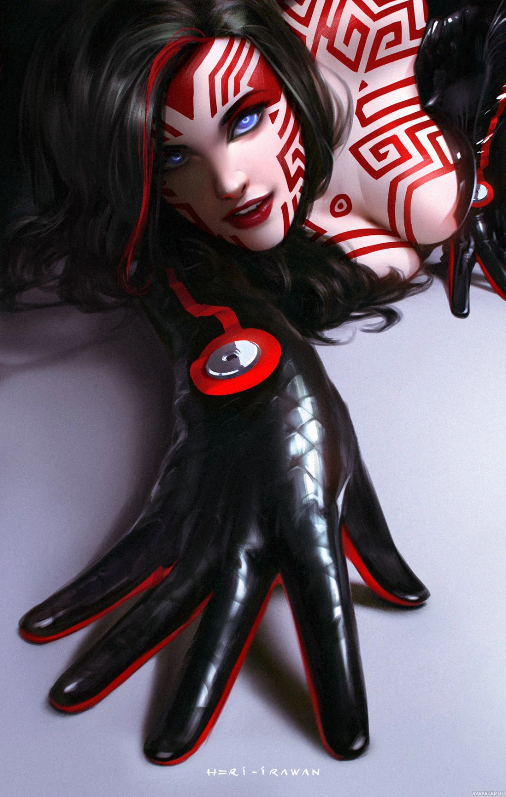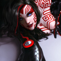 red accents on her face and hands. Her expression is intense or focused, and she seems to be in