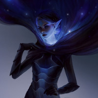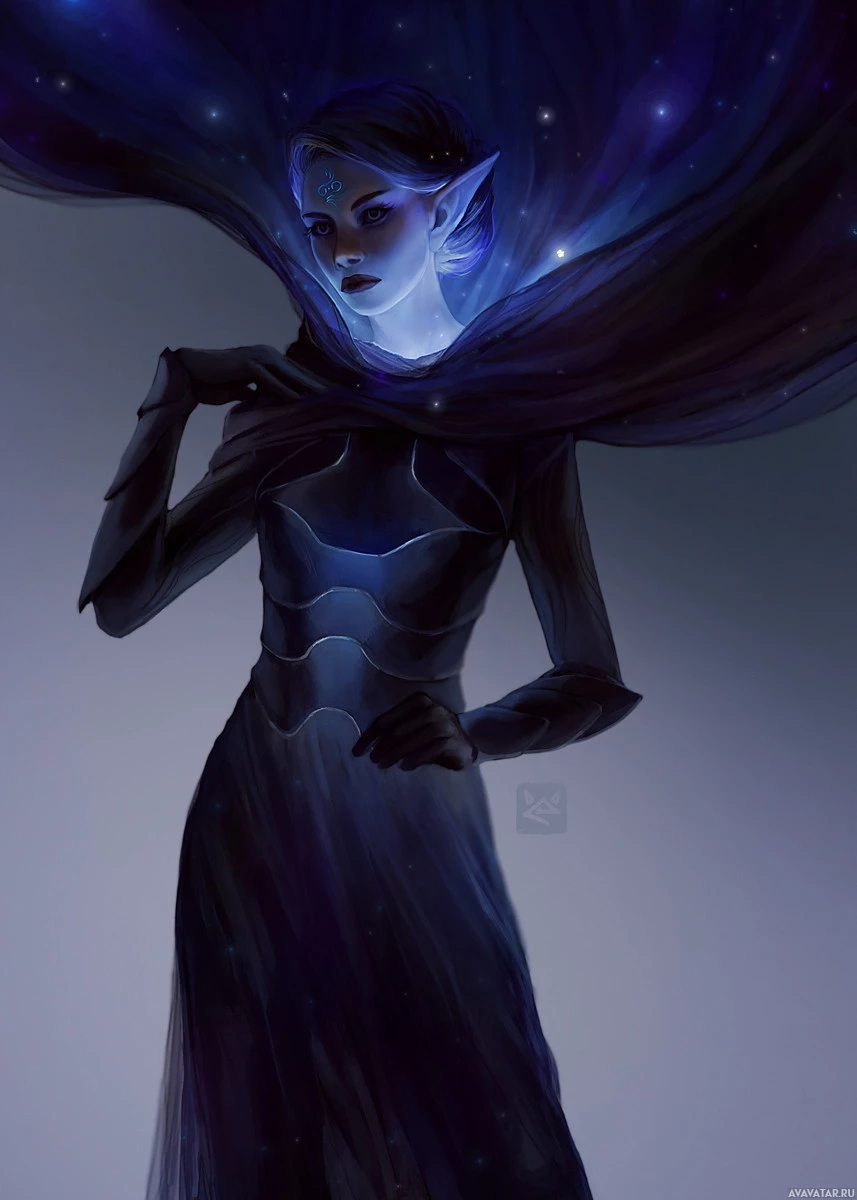 a fantasy setting. This character is standing against a background that looks like space, with stars visible, which adds to the mystical and otherworldly feel of the artwork. The elf has pointed ears typical of elves in