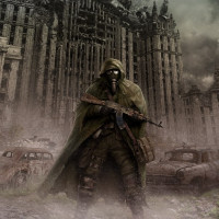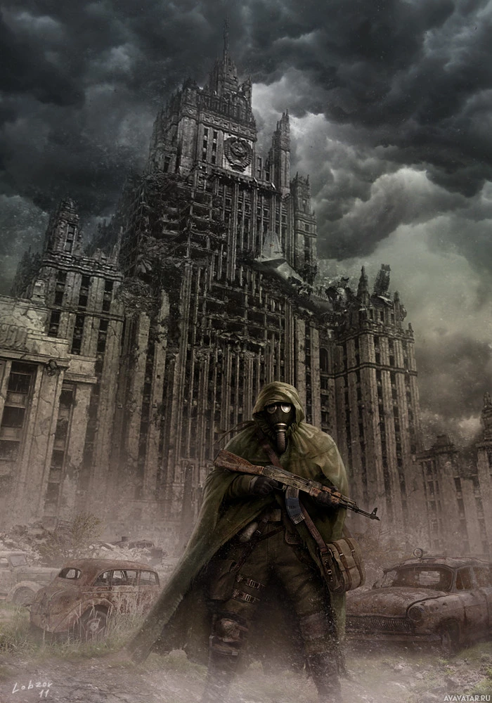 a gas mask, suggesting a hazardous environment due to radioactive contamination or airborne particles. This individual is holding what seems to be a weapon with a bayonet attached. Behind this person is a large, crumbling building with architectural elements that evoke