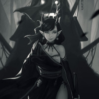 a female character from a fantasy setting. She has pointed ears characteristic of elves and is dressed in what seems to be medieval or fantasy-inspired attire, with a cloak and possibly armor. The character is looking directly at the viewer with a calm expression, while standing amidst a dark, ominous
