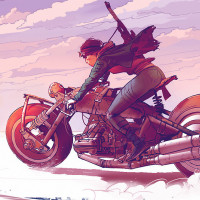 girl on a motorcycle in this image; it features a character that seems more masculine or neutral gendered, riding a classic-style motorcycle with a large front wheel and a smaller rear wheel. The background suggests an open road or desert setting at what could be either sunrise or sunset due to