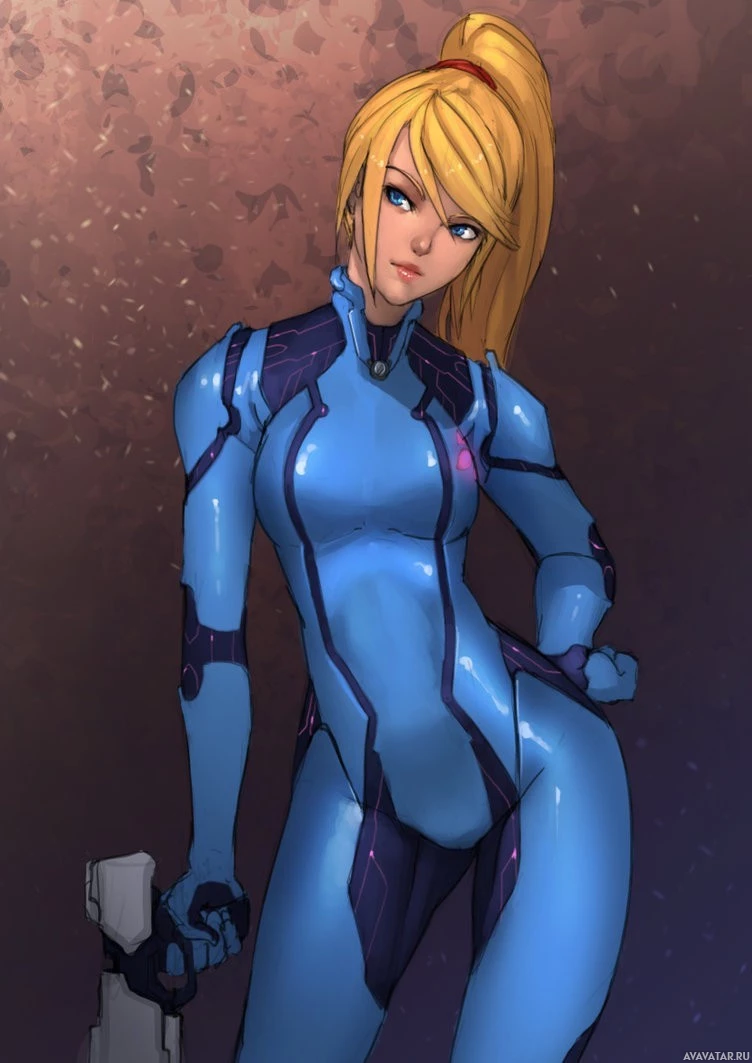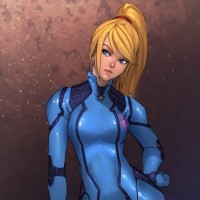 The image depicts a character who is known as Samus Aran from the "Metroid" series of