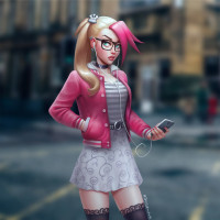 На картинке изображен анимированный персонаж, молодая женщина с розовыми волосами. Она носит очки и держит в руке телефон. Она одета в повседневную одежду, состоящую из розовой куртки над серой рубашкой и юбки с цветочным узором. Ее наряд испускает молодую и стильную атмосферу.