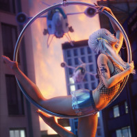 Harley Quinn, hanging from a large metal ring by her hands. She is wearing a skimpy costume and appears to be in the midst of performing a stunt or