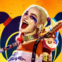 Harley Quinn, who is depicted in a stylized and vibrant manner. She appears to be wearing her signature costume with the Joker's face on it, which typically includes a white skin-tight bodysuit, black fishnet stockings, a black