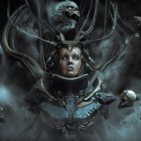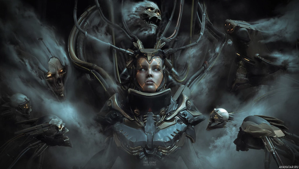 На картинке изображена тема научной фантастики, в центре которой изображен андроид или робот с гуманоидной внешностью. Вокруг этой центральной фигуры находятся различные механические конструкции и фигуры, напоминающие скелеты или механизированные организмы. Положение кажется темным, возможно, под землей или в антиутопической среде. Есть ощущение, что передовые технологии переплетаются с элементами ужаса или темной фэнтези.