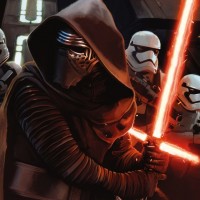 Kylo Ren, identifiable by his red lightsaber and distinctive attire with a hood, helmet, and cape. The backdrop suggests they are on the deck of a spacecraft or station within the Star