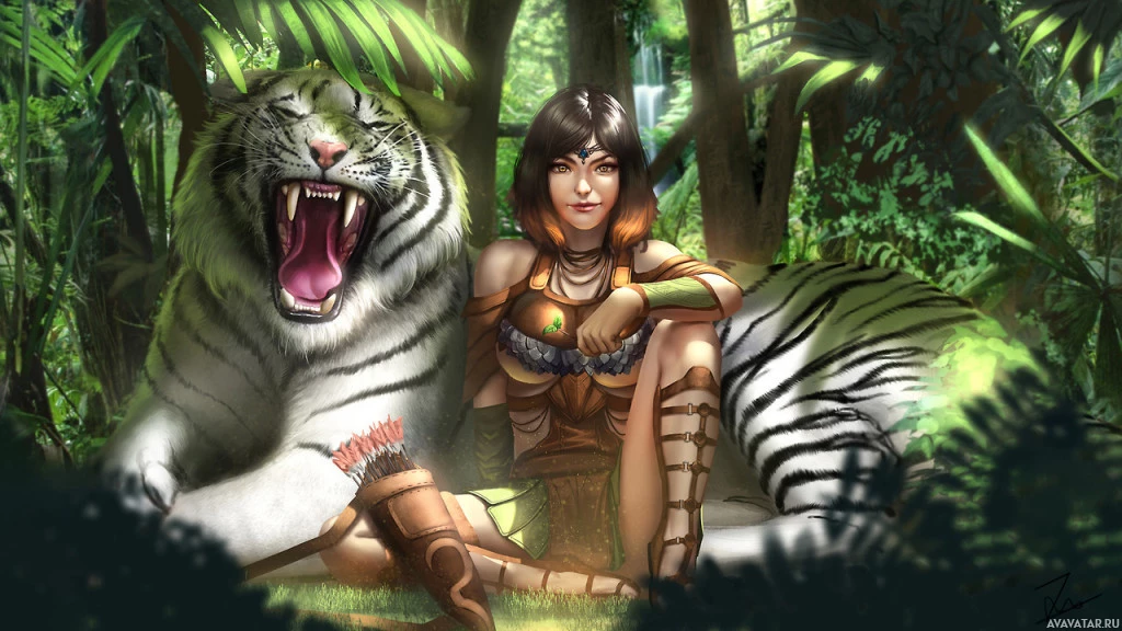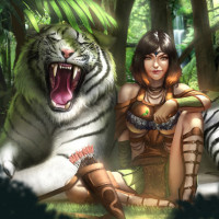 dense vegetation around her. Next to her stands a tiger, which is roaring or growling loudly. The scene seems to be set in a fantasy or adventure-themed context, possibly related to storytelling or a visual representation of a character from