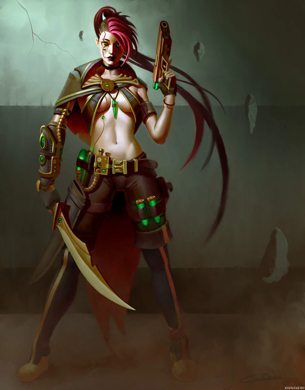 advanced technology or design. Additionally, she's wielding a pistol in her other hand, which further emphasizes her combat-ready nature. The setting appears to be a dilapidated