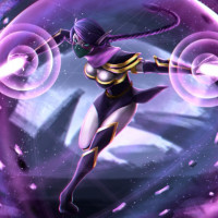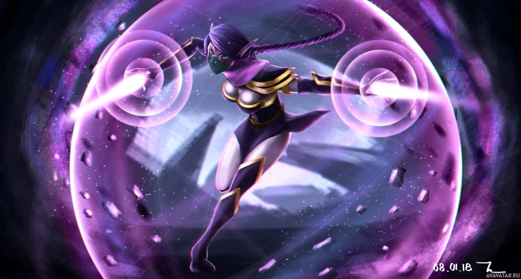 Картинка показывает анимированного персонажа в динамической позе, предполагая движение или действие. Этот персонаж стилизован под Templar Assassin из игры Dota 2. Фон имеет мистическое и магическое ощущение с закрученными фиолетовыми энергетическими узорами, которые согласуются со способностями или атаками в таких играх, как Dota 2. Одежда и поза персонажа указывают на то, что они могут использовать какую-то магическую атаку или навык.