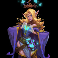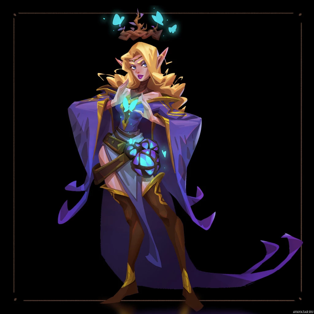 blonde hair, pointed ears characteristic of elves in fantasy genres, and is wearing a robe with a dark purple color scheme. On her head, she has what appears to be a crown or a headpiece that includes butterfly-like embellishments. The character also has a staff in one hand and seems to have a glowing blue stone on her