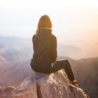 sky transitions from the bright yellows and oranges near the horizon to deeper blues as it stretches upward. The person appears to be contemplating their surroundings, possibly enjoying the solitude and tranquility of