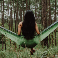 The image shows a person sitting in a hammock with their back facing the viewer. It appears to be set in a forested area, possibly during early morning or late afternoon given