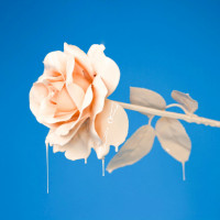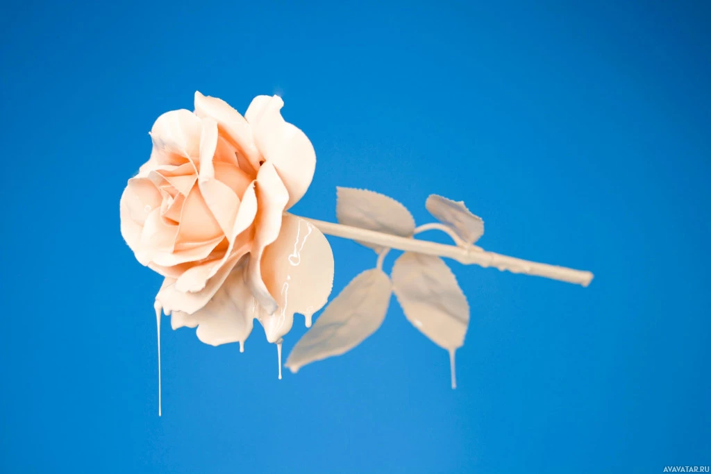 water droplets on the petals, indicating that they have likely been recently painted or touched by water. The background is plain and does not distract from the flower, which is positioned slightly off-center to the left. The overall aesthetic of the picture suggests a delicate and romantic theme.