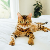 In the image, there is a cat lying on a bed. The cat appears to be looking at the camera with an alert or