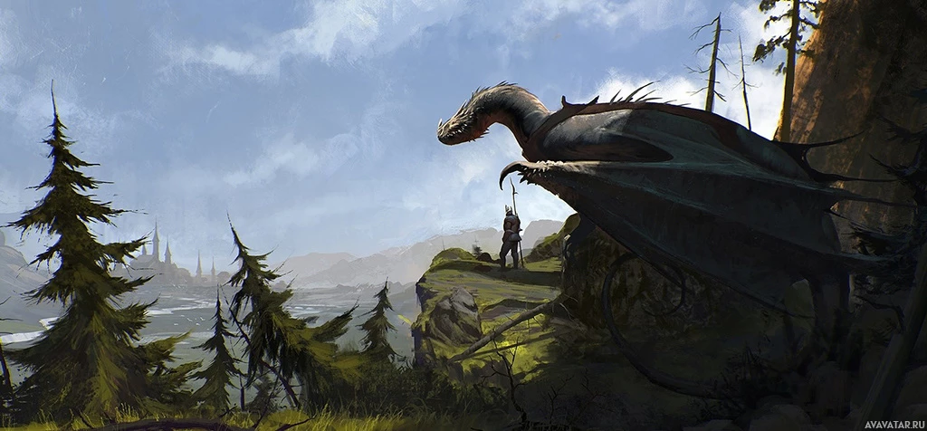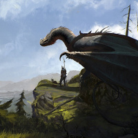 a fantasy scene featuring a dragon. The dragon appears in