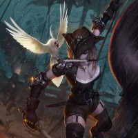The image depicts a fantasy-style illustration of a character who appears to be a pirate, given the sword she's holding. She has a bird on her arm, which could suggest some magical or mythical association. The character is standing amidst destruction and chaos, indicating