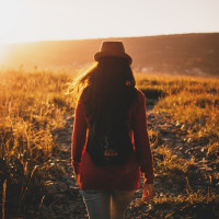 the warm lighting. The individual is wearing a hat and carrying a backpack on their shoulders. They are also wearing what seems to be a jacket, suggesting cooler