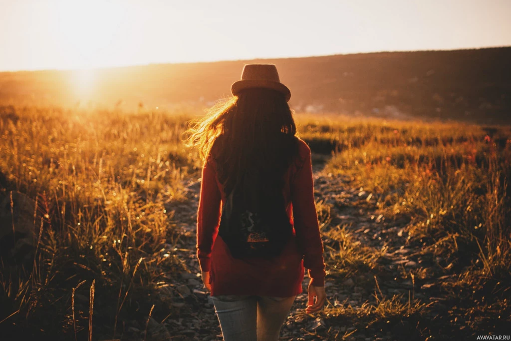 The image shows a person walking away from the viewer, captured in silhouette against what appears to be either sunrise or sunset, given