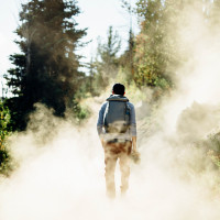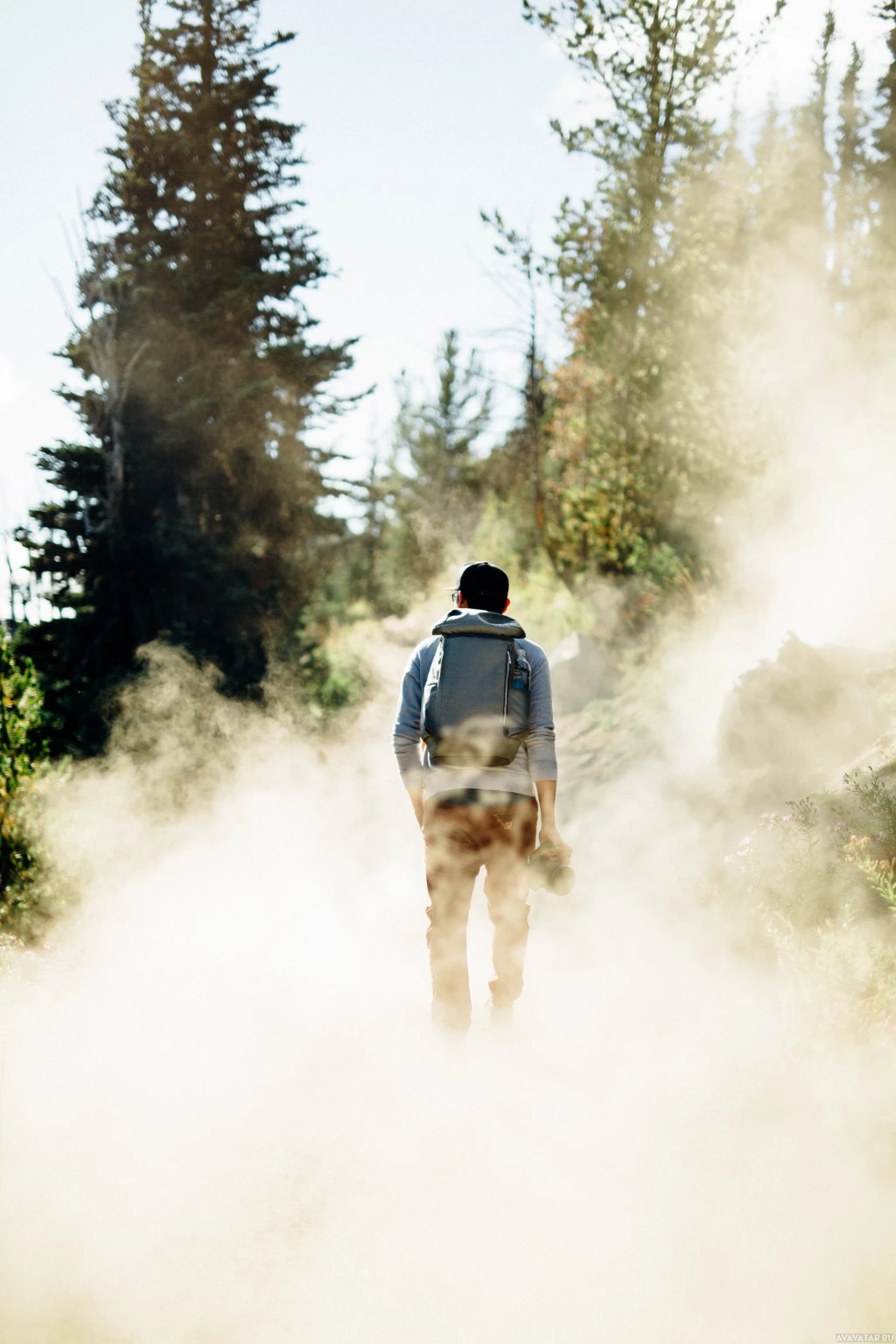 a hooded jacket or sweatshirt and seems to be carrying a backpack, suggesting they might be on a hike or a similar outdoor activity. There is dust rising from the ground due to their movement, creating