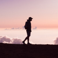 На картинке изображен силуэт человека, стоящего на скалистом фоне с рюкзаком, во время того, что кажется либо восходом солнца, либо закатом из-за теплых цветов в небе. Пейзаж бесплодный и прочный, что говорит о том, что это может быть пустыня или высотное место.